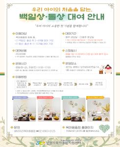 ‘백일상·돌상 대여사업’, 5월부터 추진 광명시육아종합지원센터는 영유아 가정의 양육 부담을 완화하고 의미 있는 가족 기념 문화를 지원하기 위해 ‘백일상·돌상 대여사업’을 오는 5월부터 추진한다고 20일 밝혔다. 이번 사업은 아이의 백일과 돌이라는 중요한 성장의 순간을 기념하고 합리적인 비용으로 준비할 수 있도록 지원하기 위해 마련된 배냇자리육아용품점의 신규 사업이다. 이용 대상은 육아용품점 회원 중 백일(생후 2~4개월) 또는 돌(생후 11~13개월)을 맞이하는 영아 가정이며, 대여 비용은 2만 원이다. 신청은 매월 1일 13시부터 다음 달 이용분에 대해 예약 접수하며, 지정된 기간에 방문하여 대여 후 반납하는 방식으로 운영된다. 센터는 벚꽃·개나리 콘셉트의 백일상 2세트와 돌상 2세트를 구성하여, 가정에서도 손쉽게 완성도 높은 기념 촬영과 행사를 진행할 수 있도록 지원한다. 또한 신청부터 반납까지 절차를 간소화하여 이용자의 편의성을 높였다. 광명시육아종합지원센터 김주영 센터장은 “아이의 첫 기념일은 가족에게 매우 소중한 순간인 만큼, 경제적 부담 없이 의미 있는 시간을 보낼 수 있도록 본 사업을 기획하였다”며,“앞으로도 가정양육 지원을 위한 다양한 서비스를 지속적으로 확대해 나가겠다”고 밝혔다. 본 대여 서비스는 경기도 광명시 오리로942번길 14(어울리기 문화발전소 내) 육아용품점에서 운영되며, 자세한 사항은 육아용품점 또는 센터 홈페이지를 통해 확인할 수 있다. 【Copyrightsⓒ베이비뉴스 pr@ibabynews.com】 [원문 보기] 클릭
