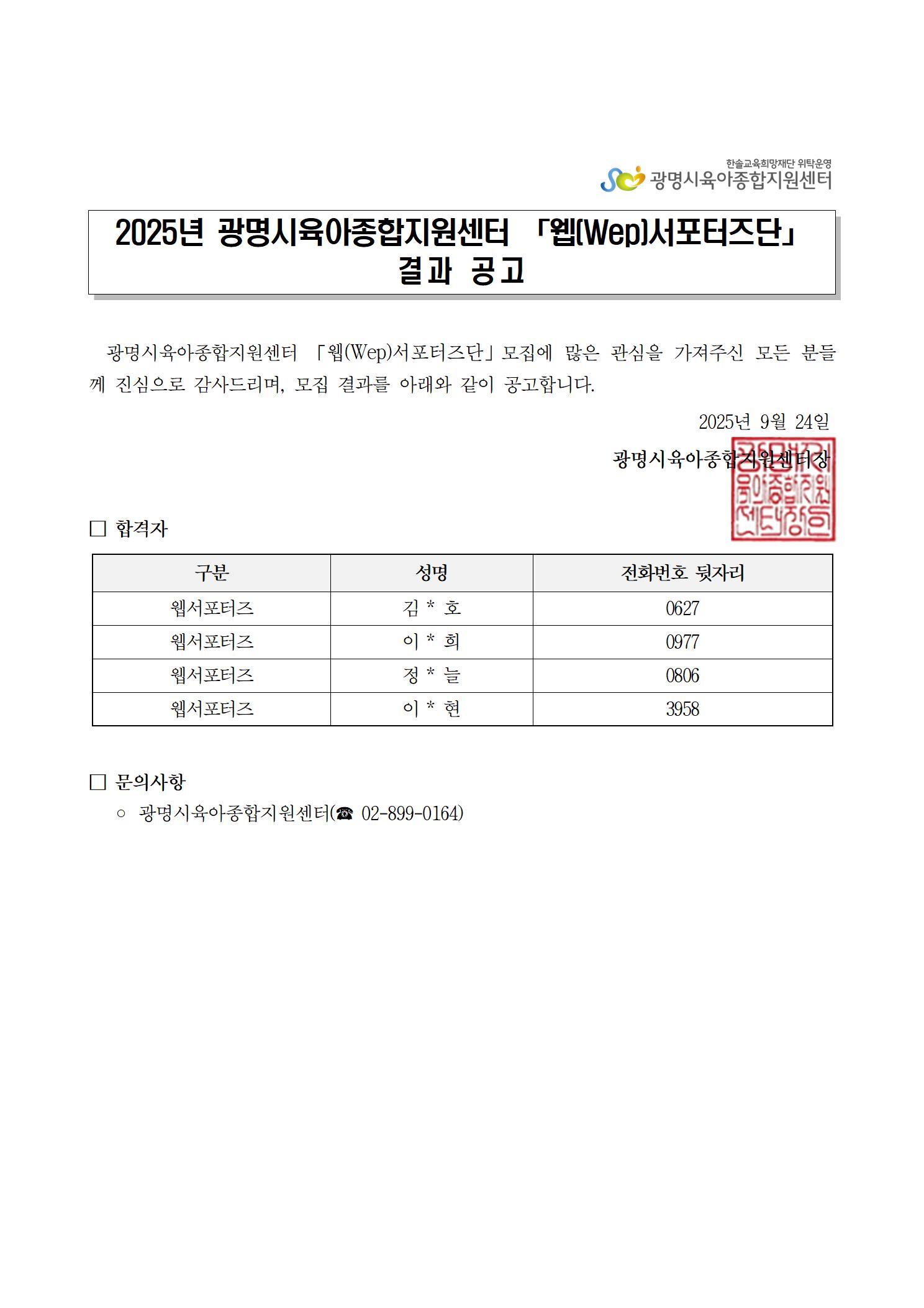 [공고] 2025년 광명시육아종합지원센터 「웹(Wep)서포터즈단」 모집 결과 공고