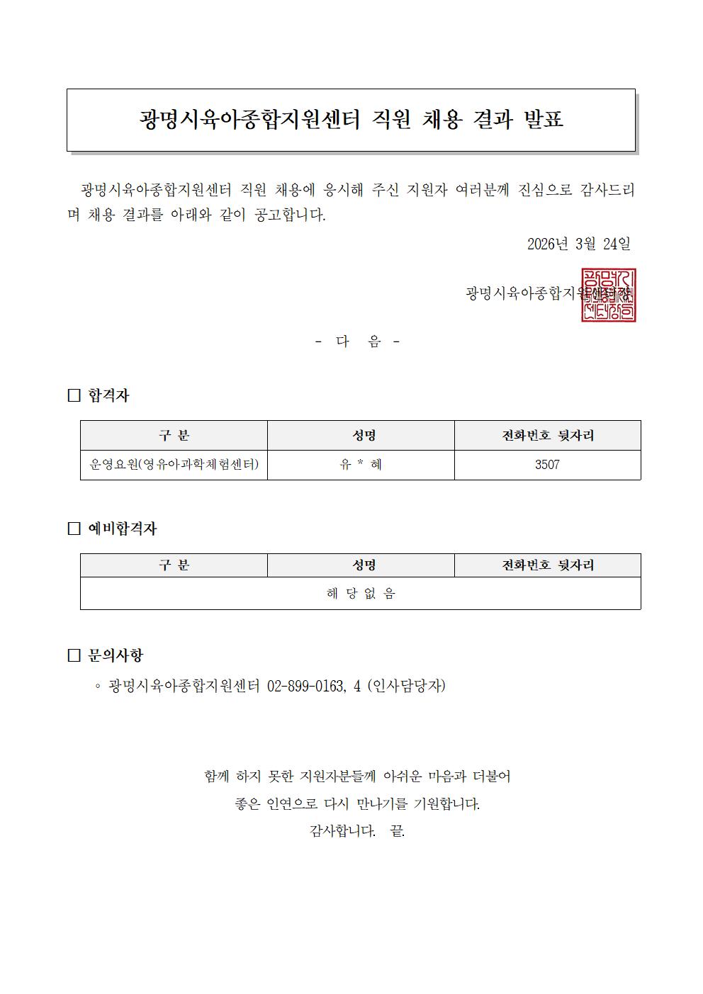 [채용] 광명시육아종합지원센터 운영요원(영유아과학센터) 채용 결과 공고