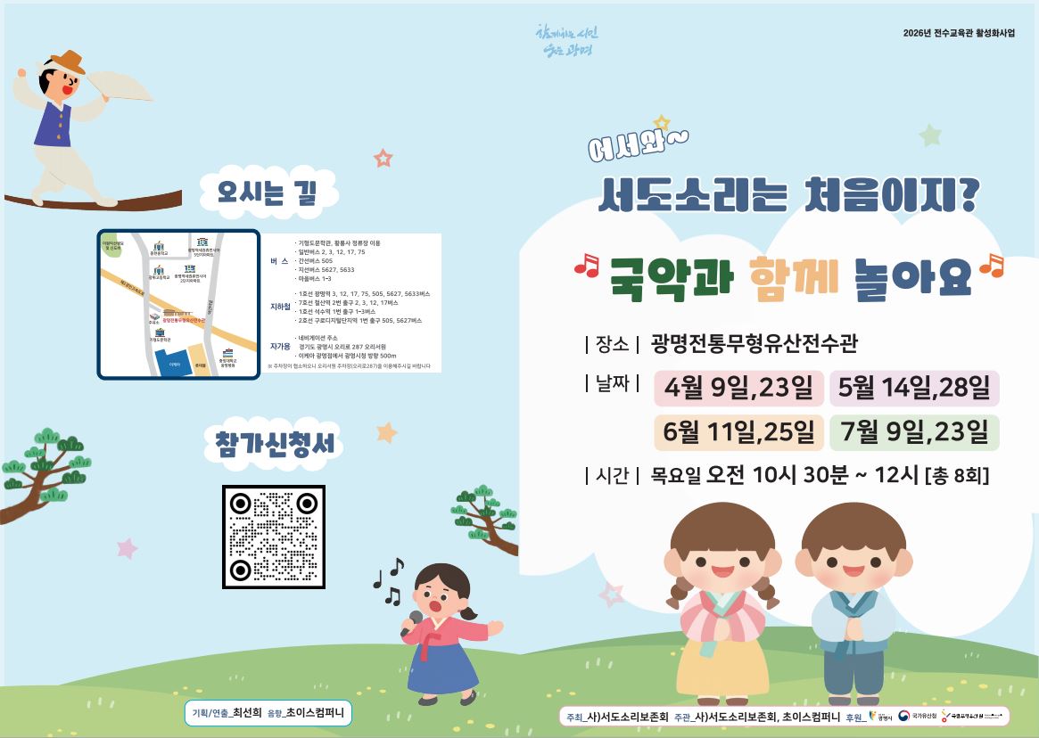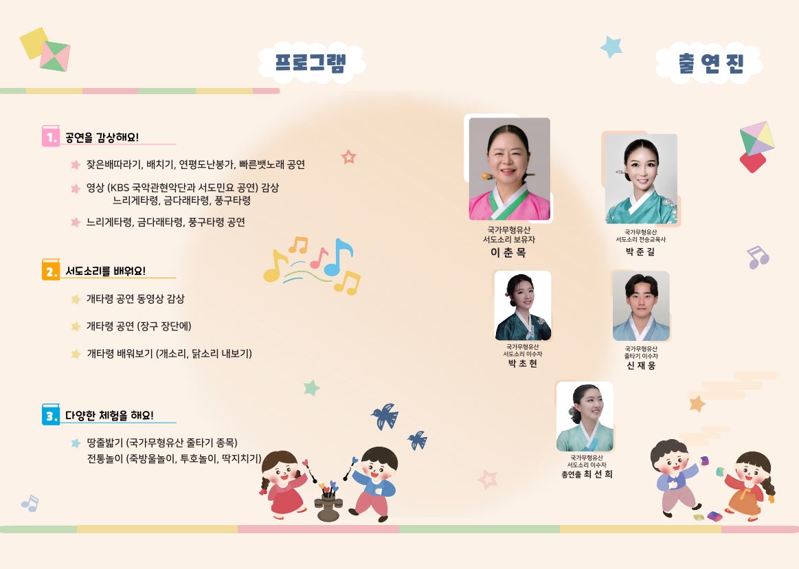 (사)서도소리보존회에서는 국가유산청 전수교육관 활성화사업의 일환으로 미취학 아동을 대상으로 국가무형유산 서도소리 종목을 공연과 체험을 통해 쉽고