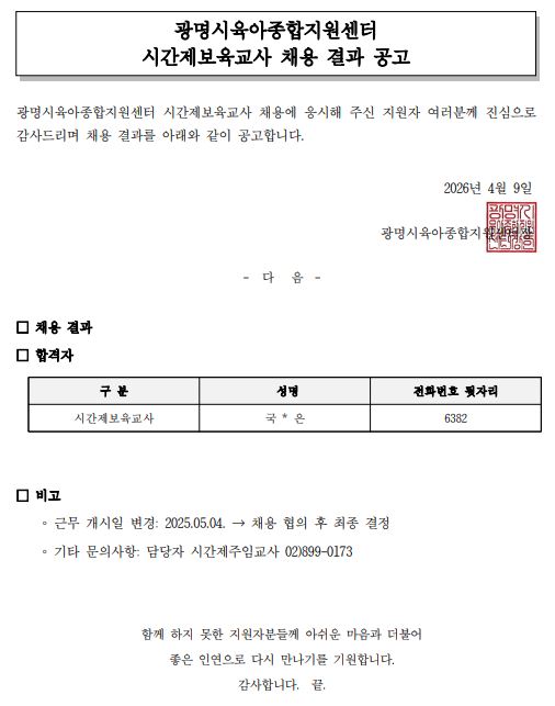 [채용] 광명시육아종합지원센터 시간제보육교사 채용 결과 공고
