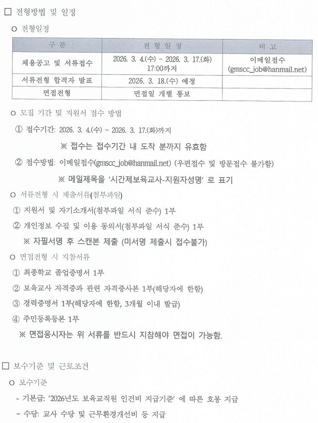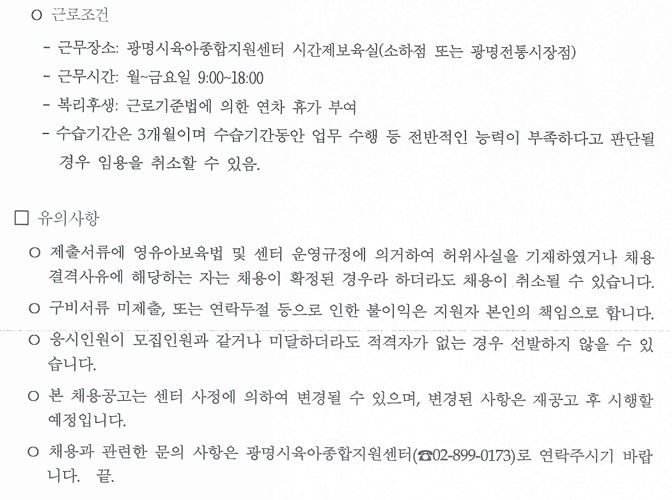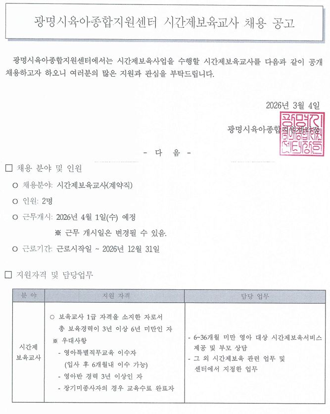 [채용] 광명시육아종합지원센터 시간제보육교사 채용 공고