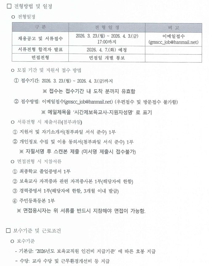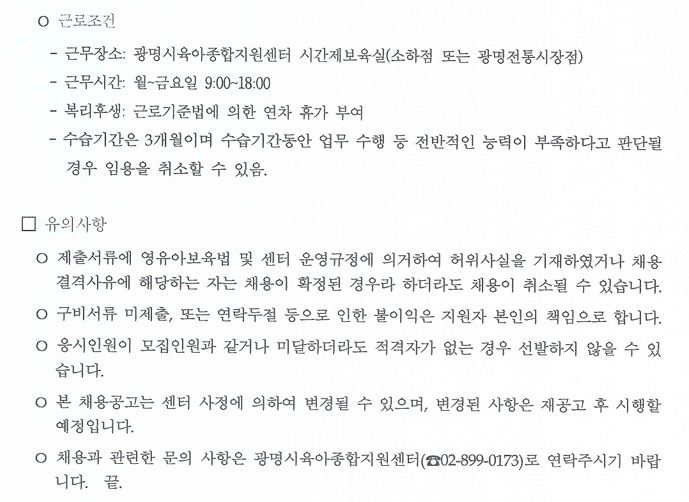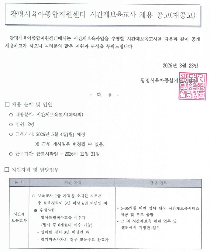 [채용] 광명시육아종합지원센터 시간제보육교사 채용 공고(재공고)