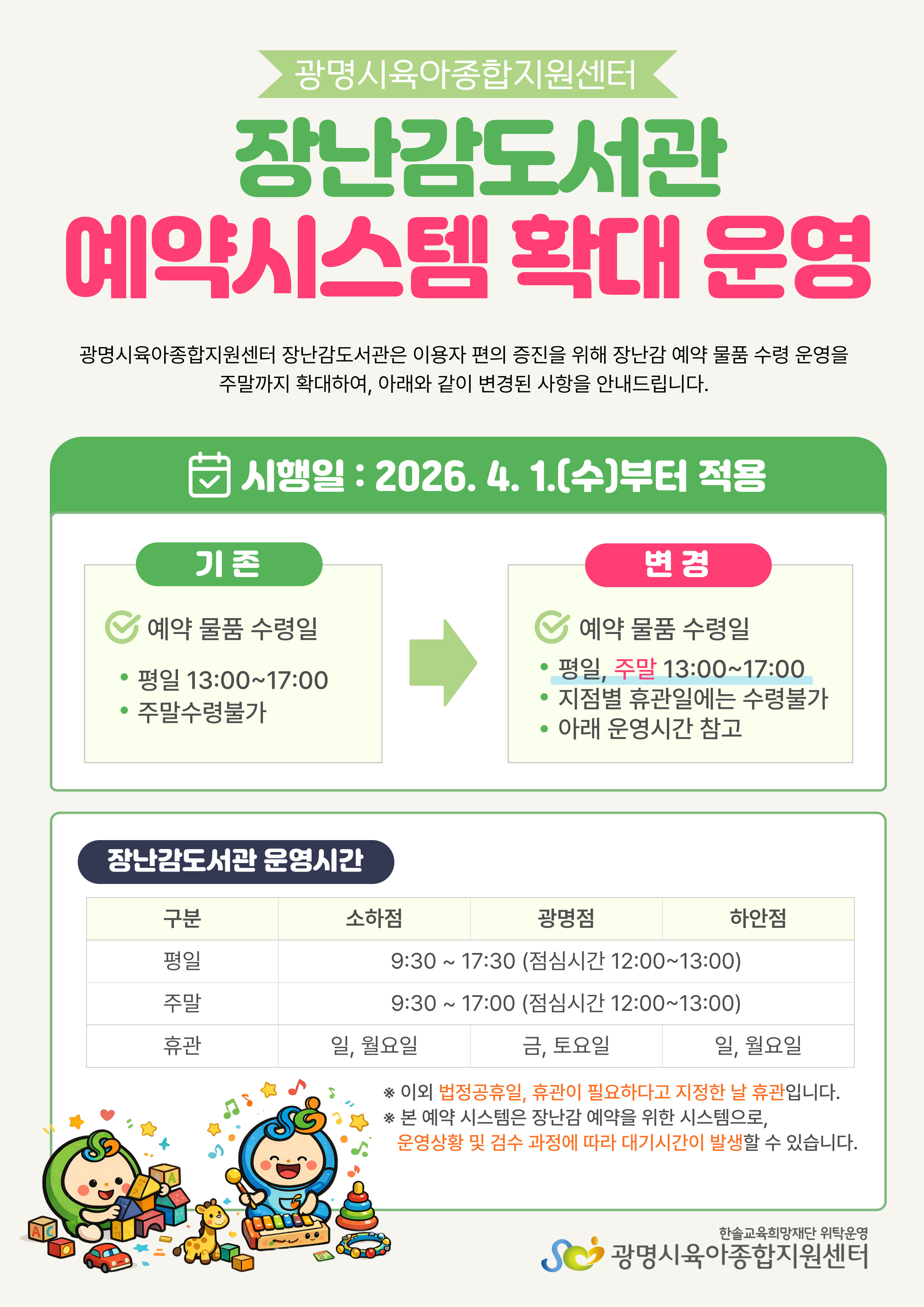 [공지] [4월 1일(수)부터 적용] 장난감도서관 예약시스템 확대 운영