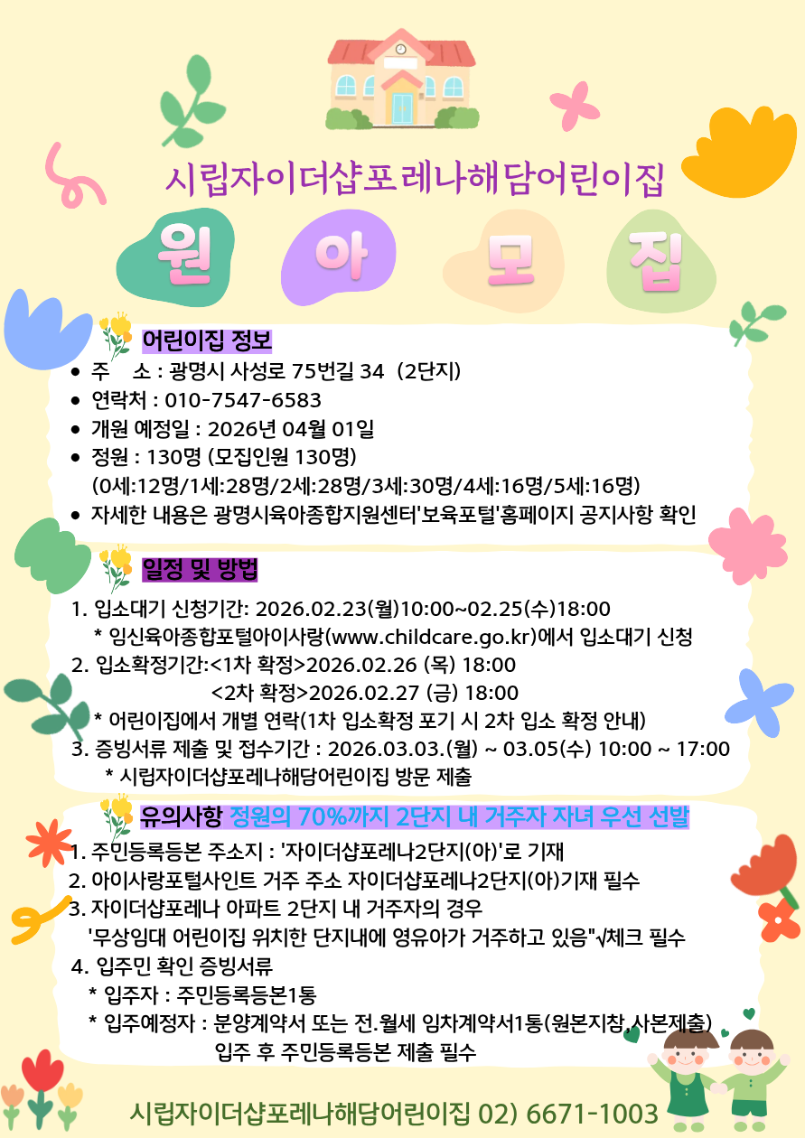 [공고] 시립자이더샵포레나해담어린이집 원아모집 홍보문