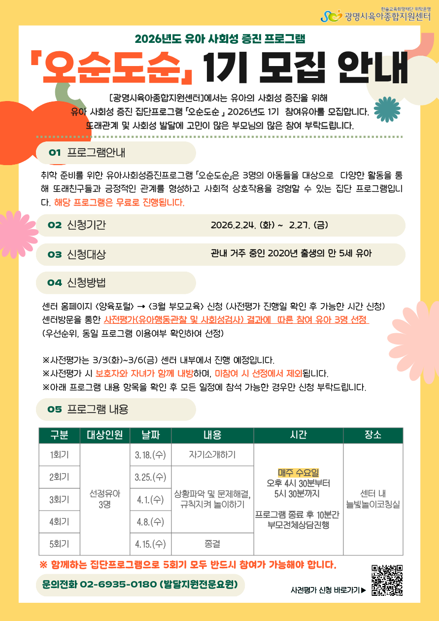 [안내] ★20년생 대상★ 2026년 유아 사회성 증진프로그램 [오순도순] 1기 사전평가 신청 안내