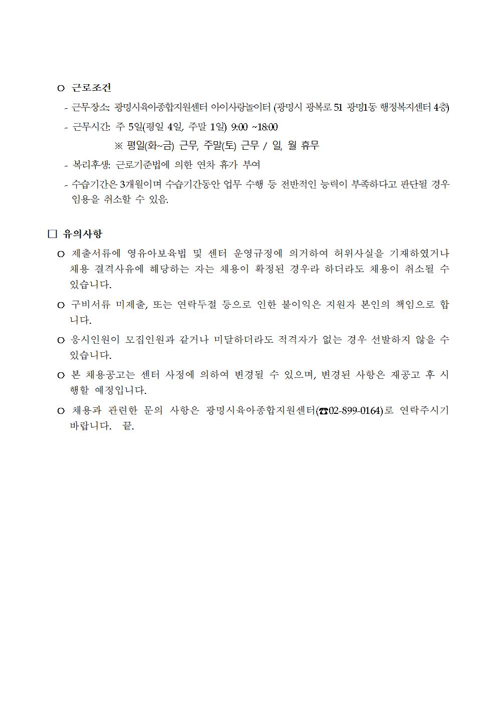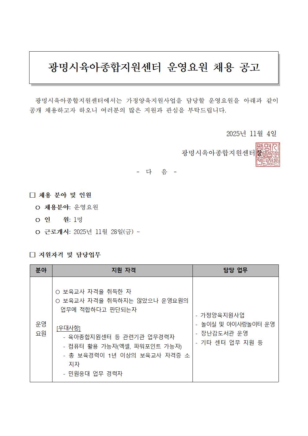 [채용] [광명시육아종합지원센터] 운영요원 채용공고