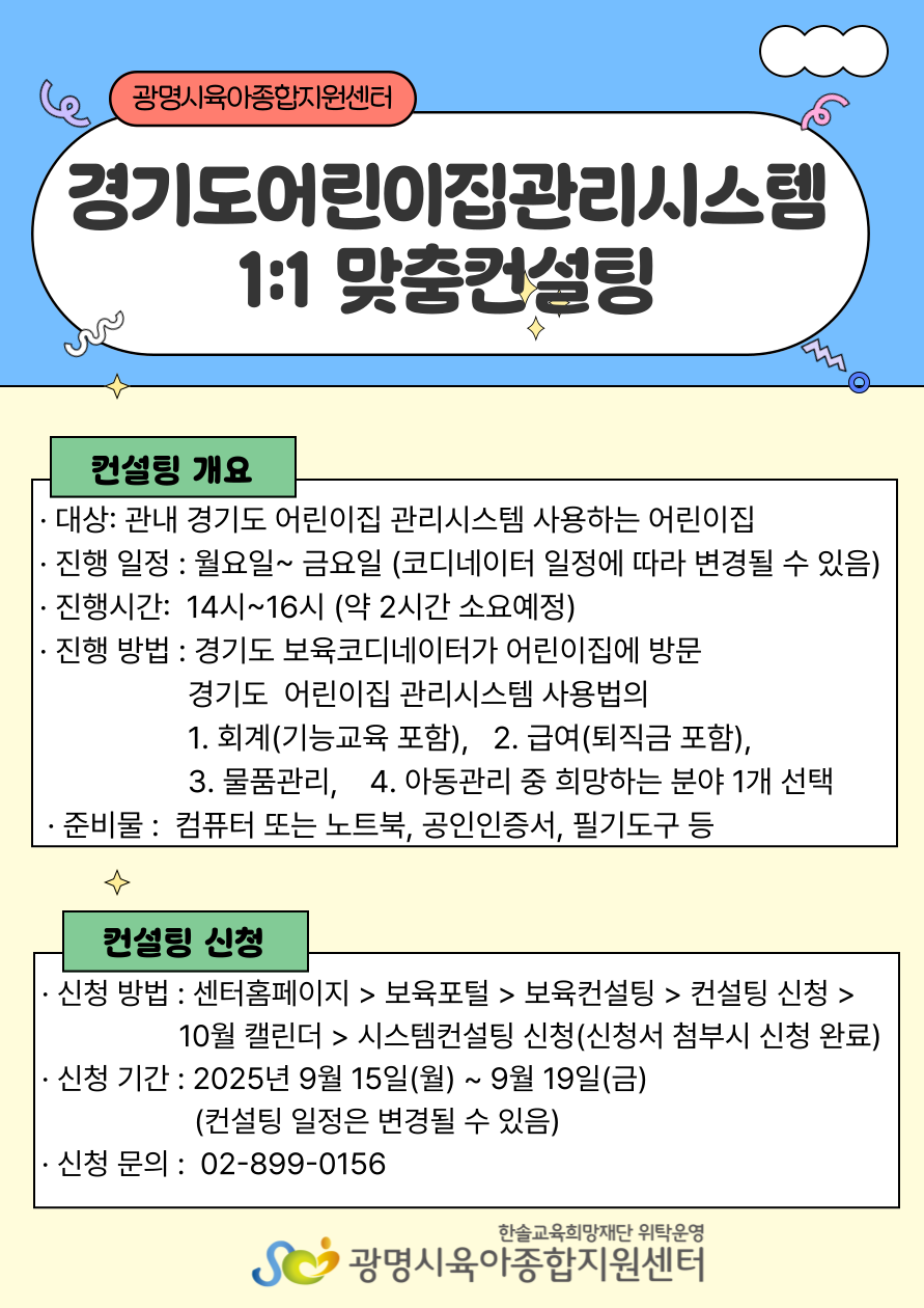 2025년 10월 경기도 어린이집 관리시스템 1:1 맞춤형 컨설팅 2025.10.01(수) 14:00 ~ 18:00